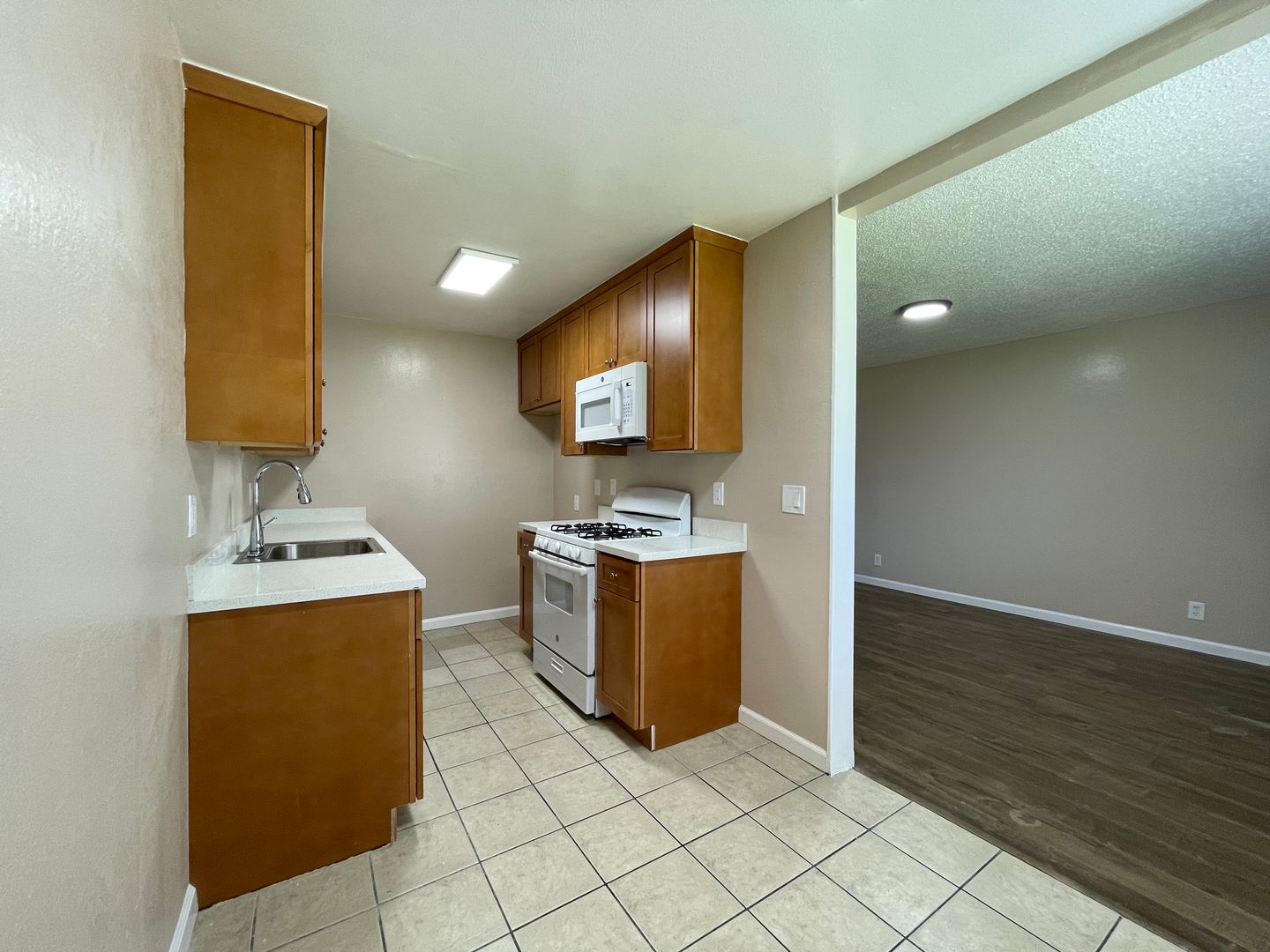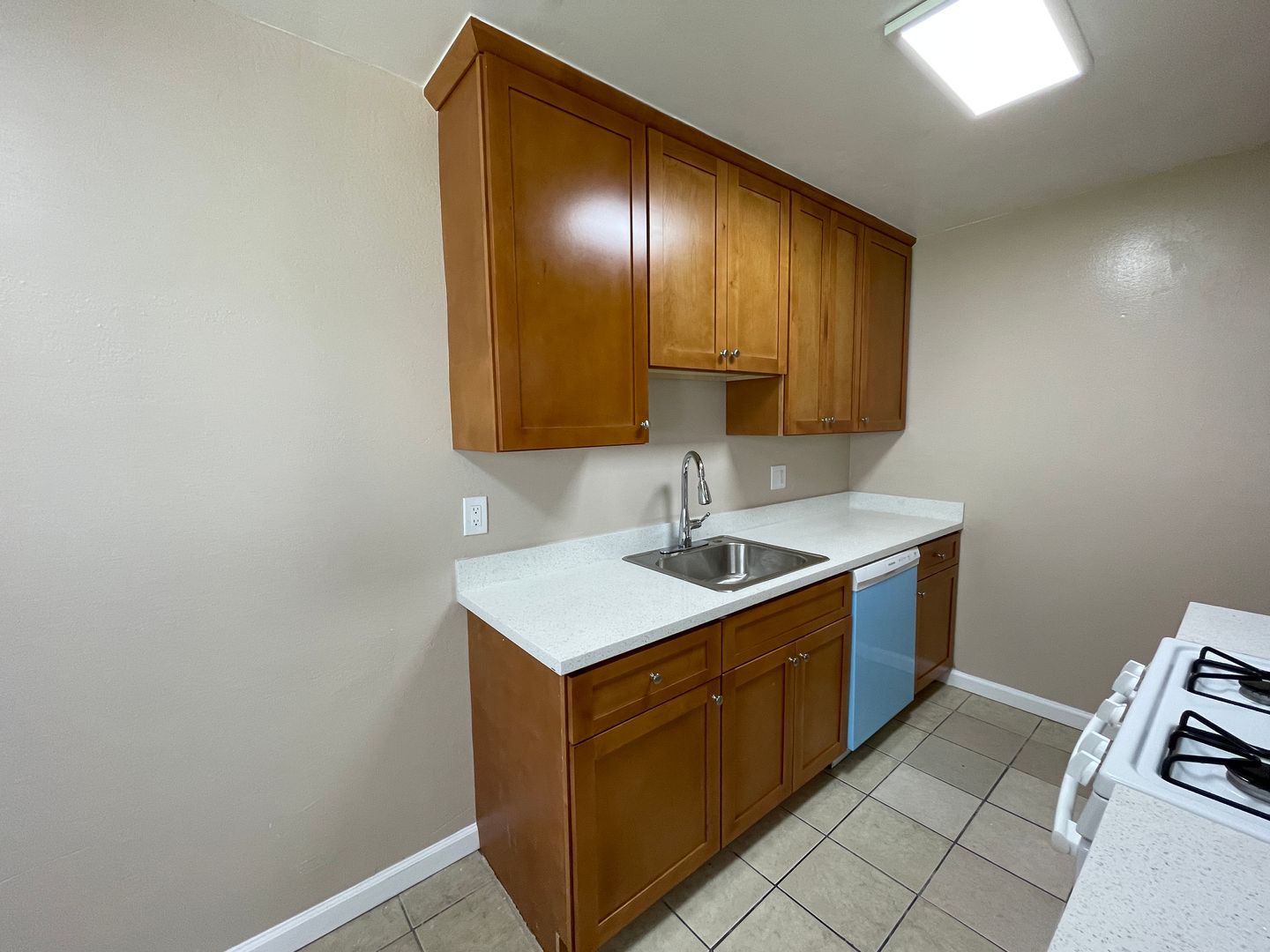 Galley kitchen with granite counters