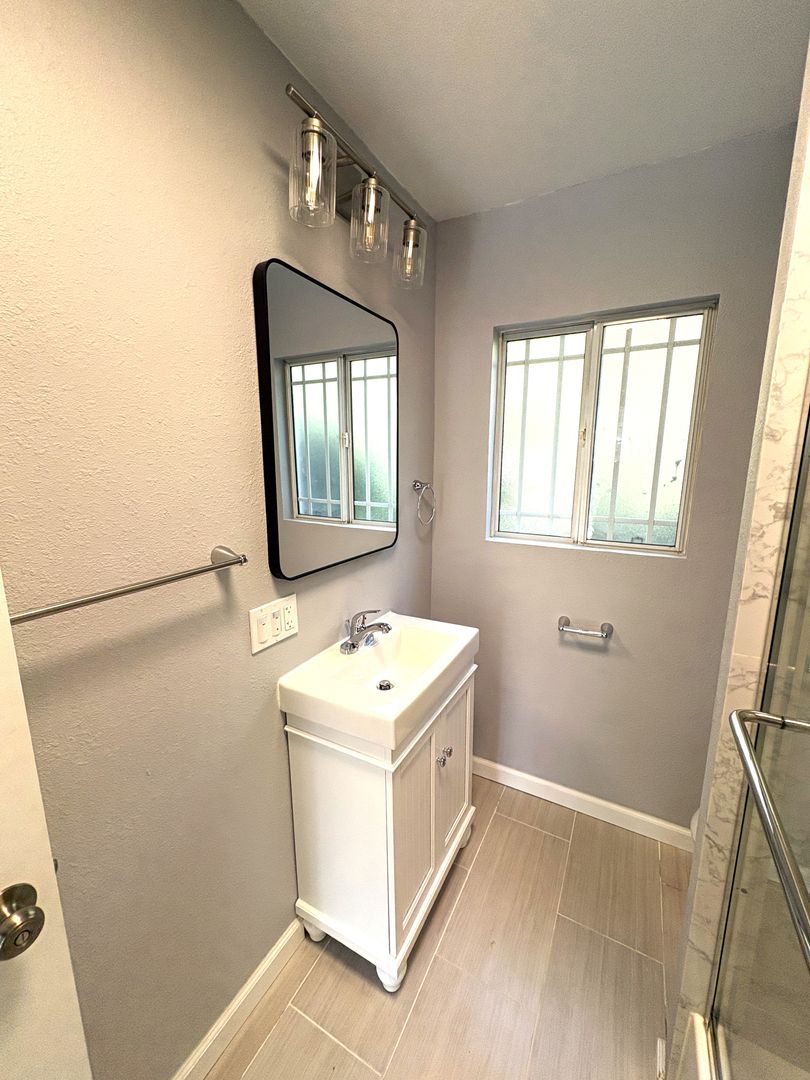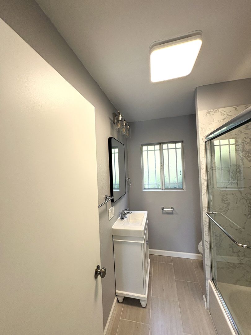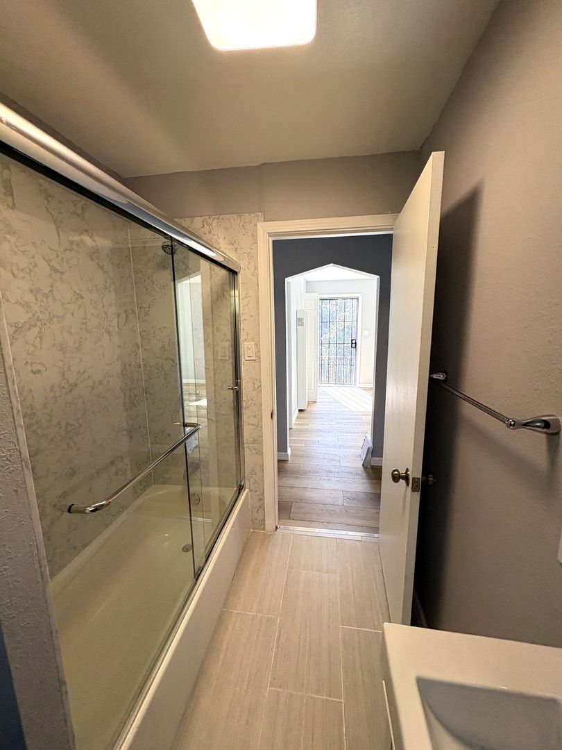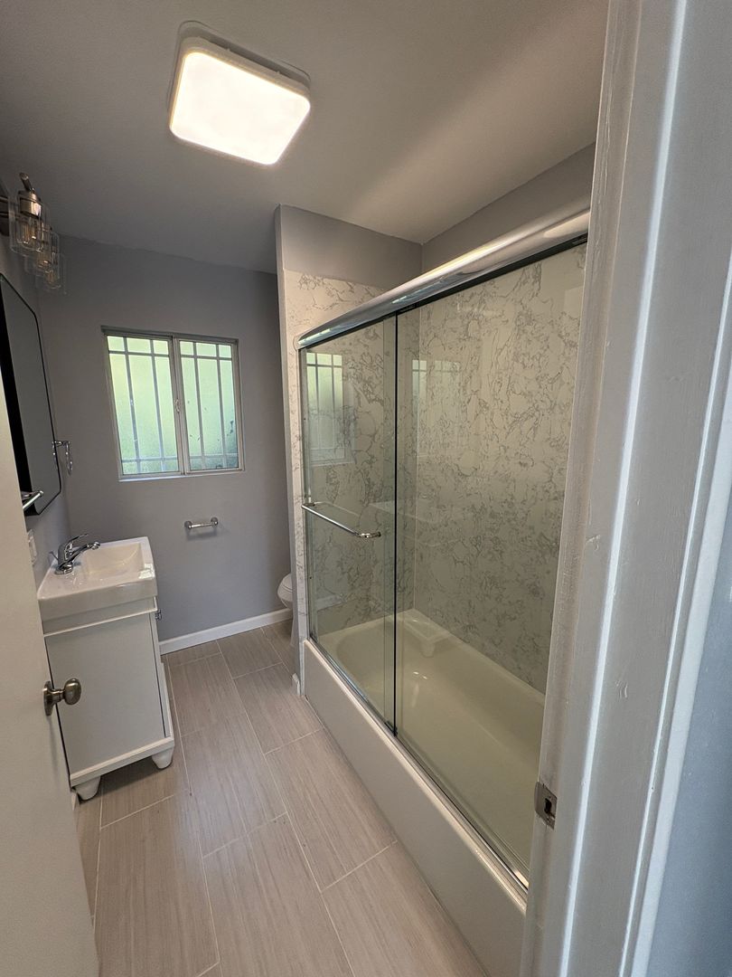 * Newly renovated bathroom with sliding glass shower doors